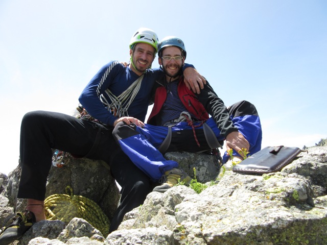 Ese largo lo juntamos a los 25 metros restantes que quedaban de via , dando un largo mantenido y bonito que nos deja prácticamente en la cumbre (unos metros más abajo ) desde donde alcanzamos la repisa donde está el primer rapel...